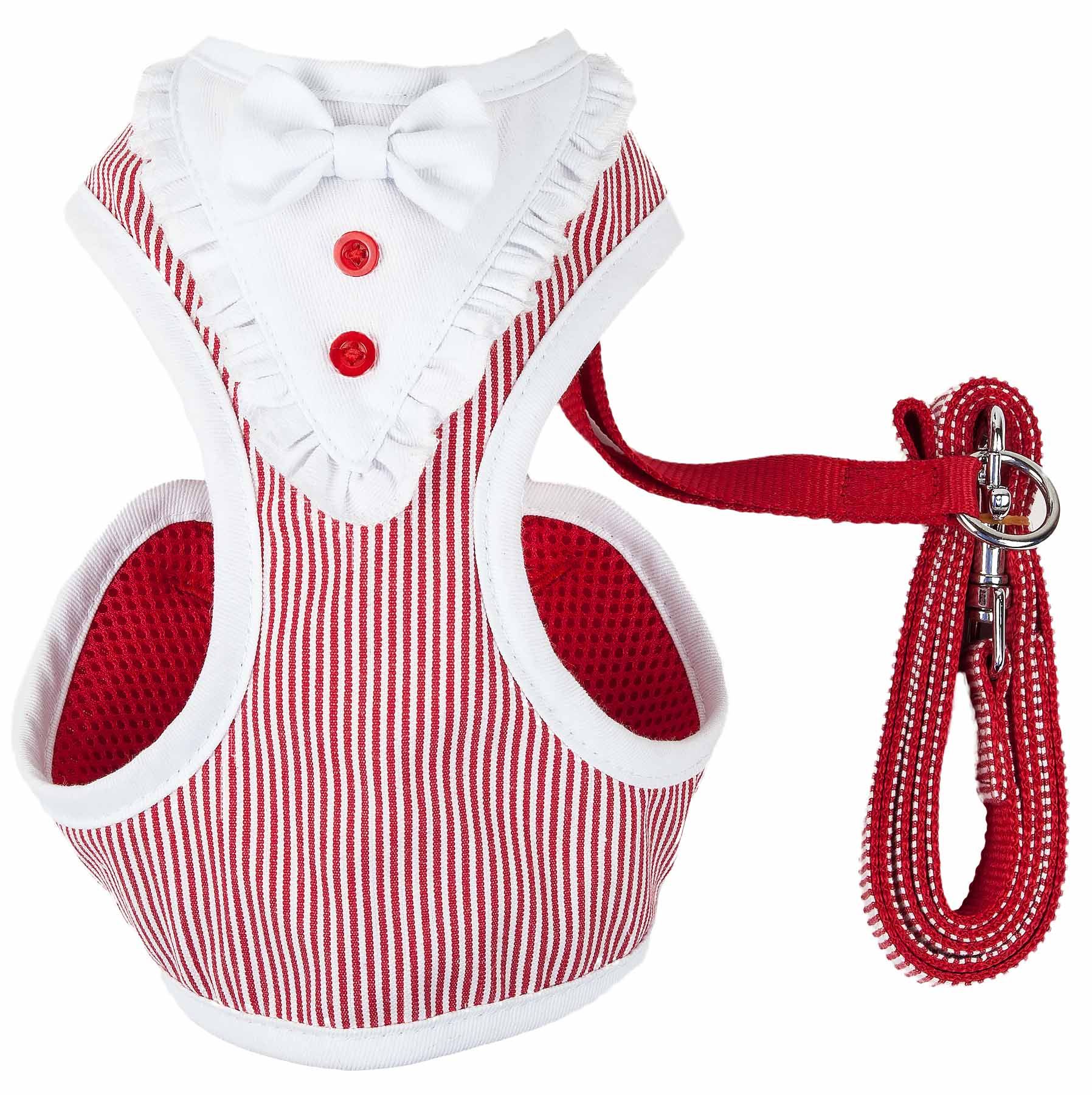 The Pet Life LUXE 'Spawling' 2-in-1 Mesh Reversed Adjustable Dog Harness-Leash w/ Fashion Bowtie features a blended exterior that is reversed with breathable accented Micro-mesh on the Harness for premium comfort. The Harness features well-coordinated stunning vertical patterned stripes that resemble a Kitchen-like smock dress with a well coordinated bowtie that sits above a ruffled smock-like material with wonderfully accented buttoned trims. The back of the harness is completely adjustable with dual stainless steel hooks that connect to the swivel hook on the leash for multi-directional pull. The Spawling harness was specially engineered to limit stress around the stomach by placing light stress around the sternum for proper comfort. Features reinforced stitching for durability. Available in Multiple Sizes and Colors.